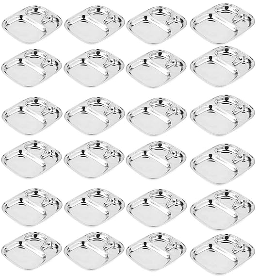 Home UTENSILS Palomino 3 in 1 Stainless Steel Plates with Compartments | Tiffin Plates | Idli Sambhar Plates | Partition Plates | Breakfast Plate | Steel Plates for Lunch/Dinner (Set of 24 Plates)