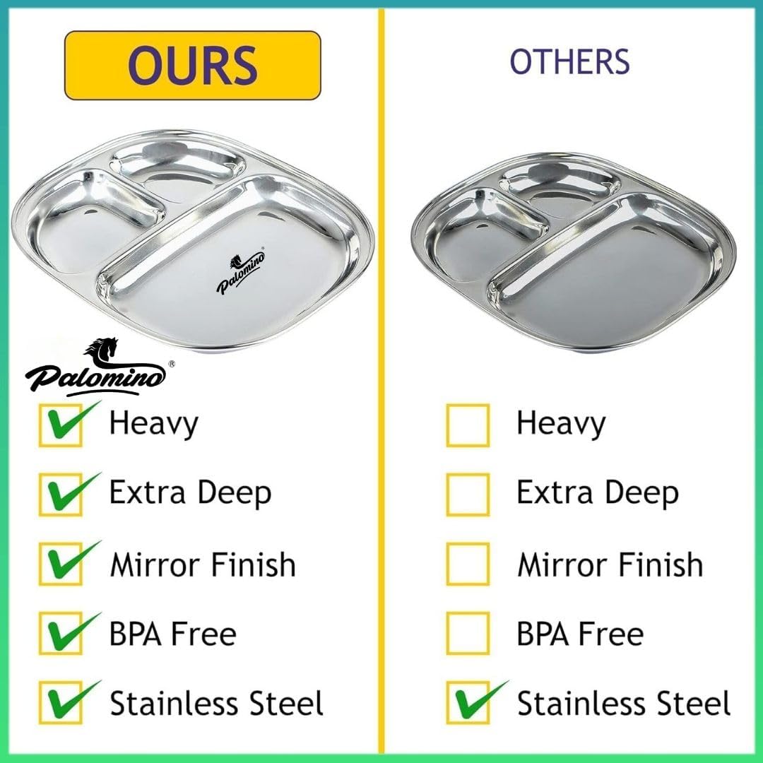 Palomino 3 in 1 Stainless Steel Plates with Compartments | Tiffin Plates | Idli Sambhar Plates | Partition Plates | Breakfast Plate | Steel Plates for Lunch/Dinner (Set of 6 Plates) ₹2,599.00 Original price was: ₹2,599.00.₹1,425.00Current price is: ₹1,425.00.