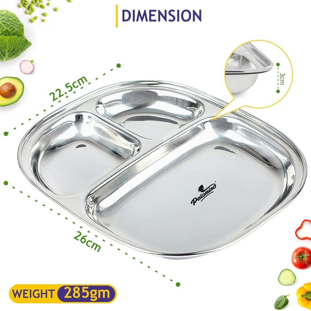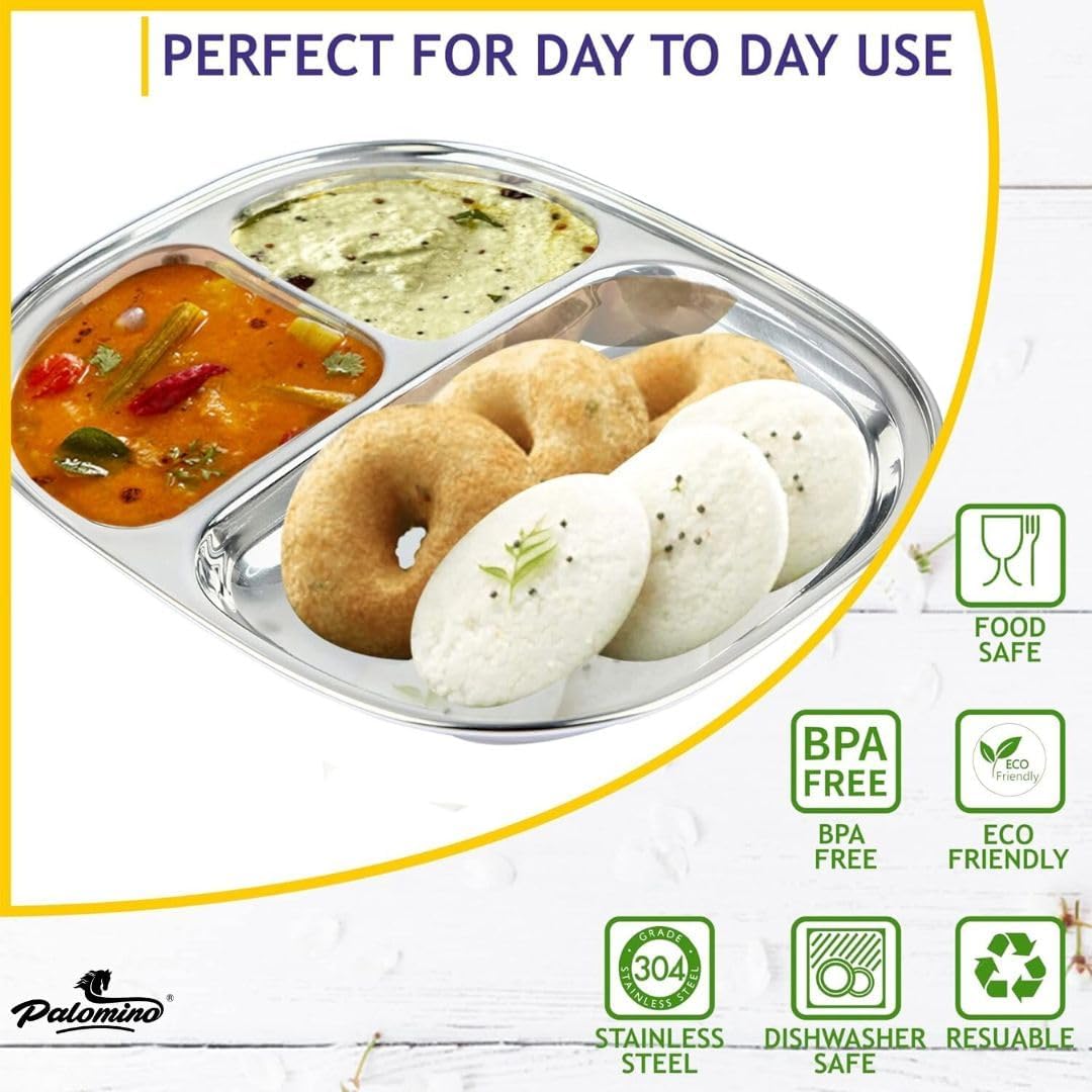 Palomino 3 in 1 Stainless Steel Plates with Compartments | Tiffin Plates | Idli Sambhar Plates | Partition Plates | Breakfast Plate | Steel Plates for Lunch/Dinner (Set of 4 Plates)