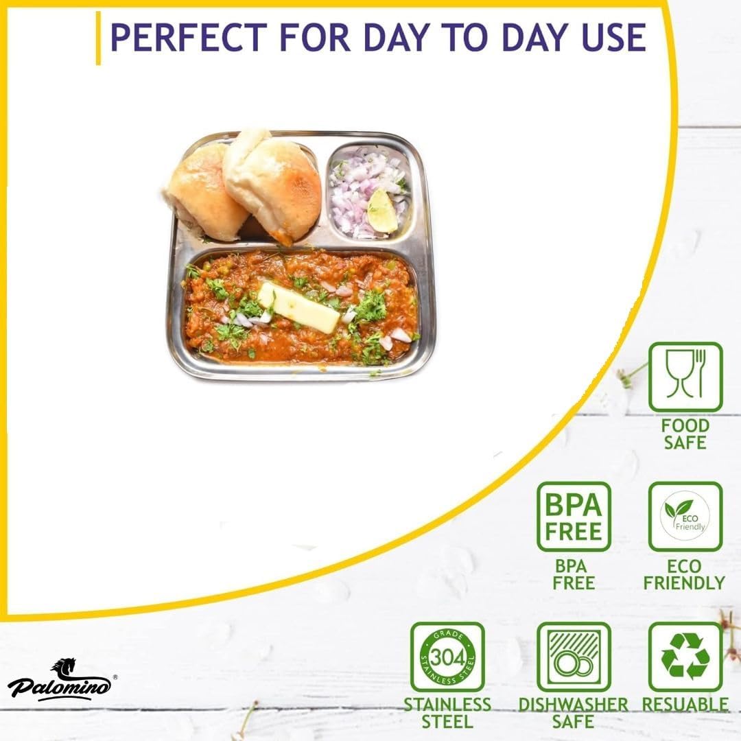 Palomino 3 in 1 Stainless Steel Plates with Compartments | Tiffin Plates | Idli Sambhar Plates | Partition Plates | Breakfast Plate | Steel Plates for Lunch/Dinner (Set of 4 Plates)
