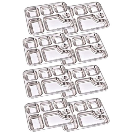 Palomino 6 in 1 Stainless Steel Plates with Compartments | Tiffin Plates | Idli Sambhar Plates | Partition Plates | Breakfast Plate | Steel Plates for Lunch | Dinner (Set of 8 Plates)