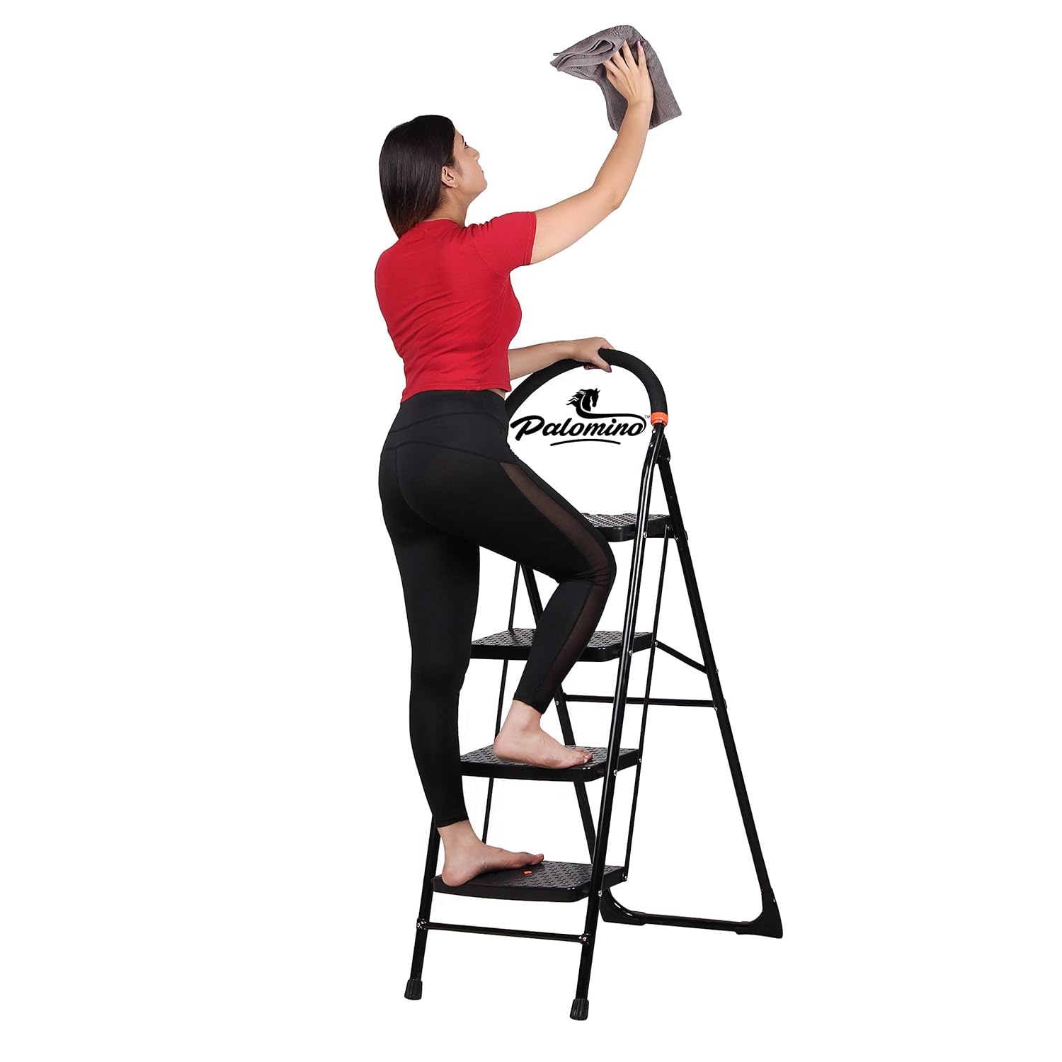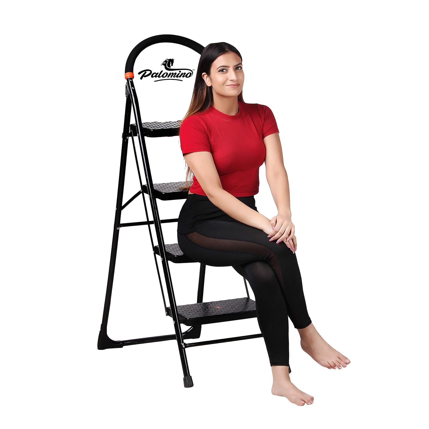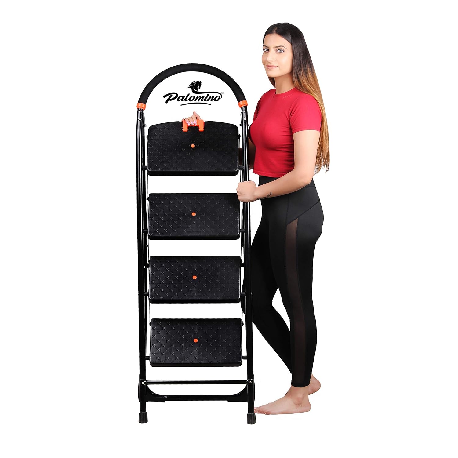 Home STEP LADDERS PALOMINO Black Heavy Duty Folding Stepladders with Wide 4 Steps Ladder Sidhi (Make in India)