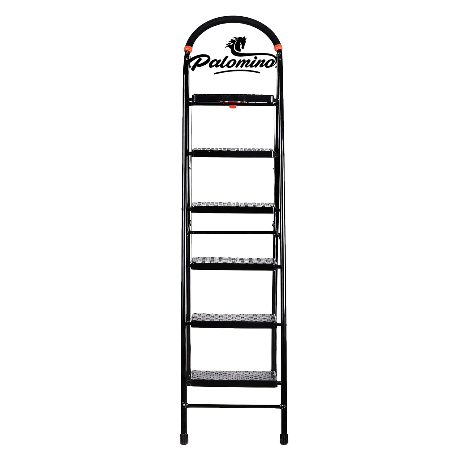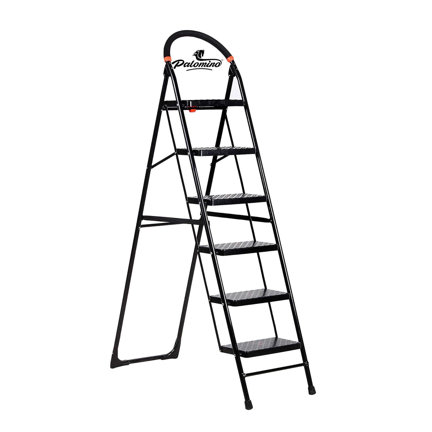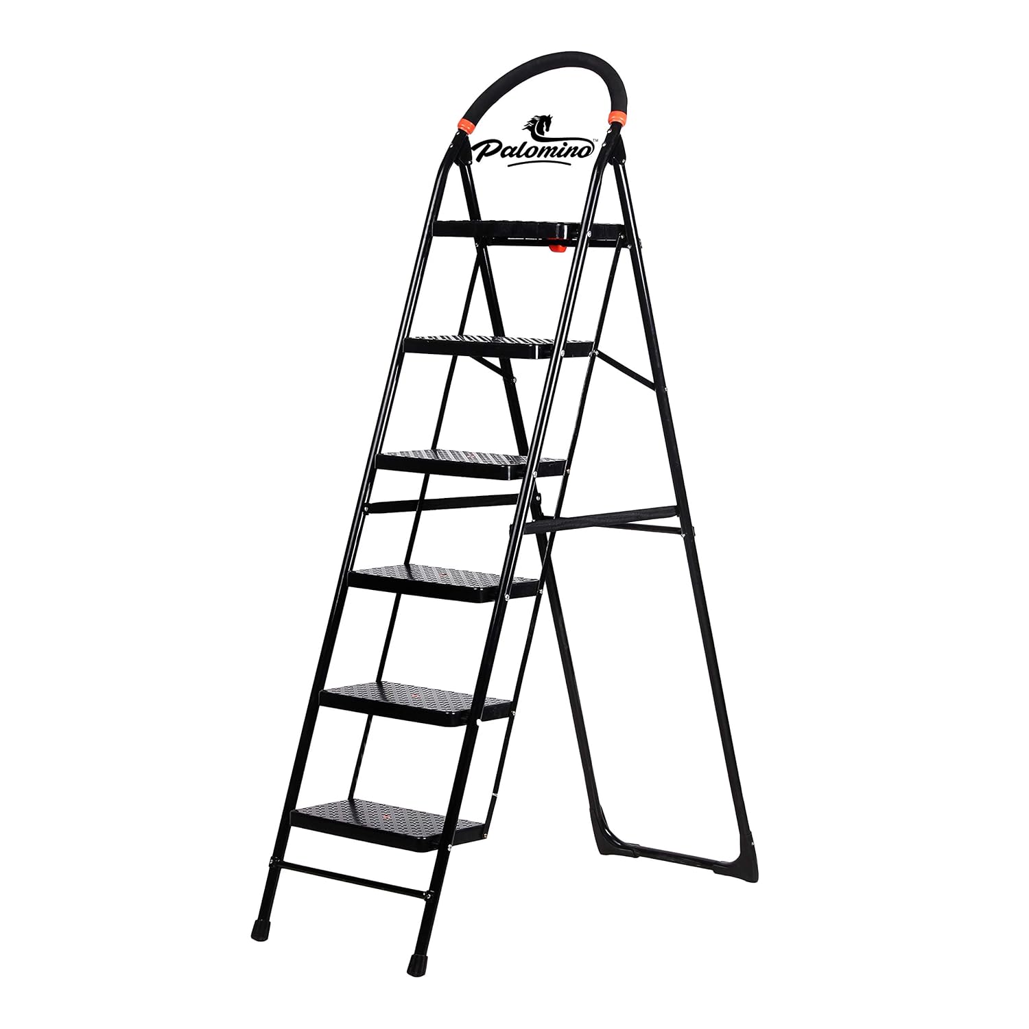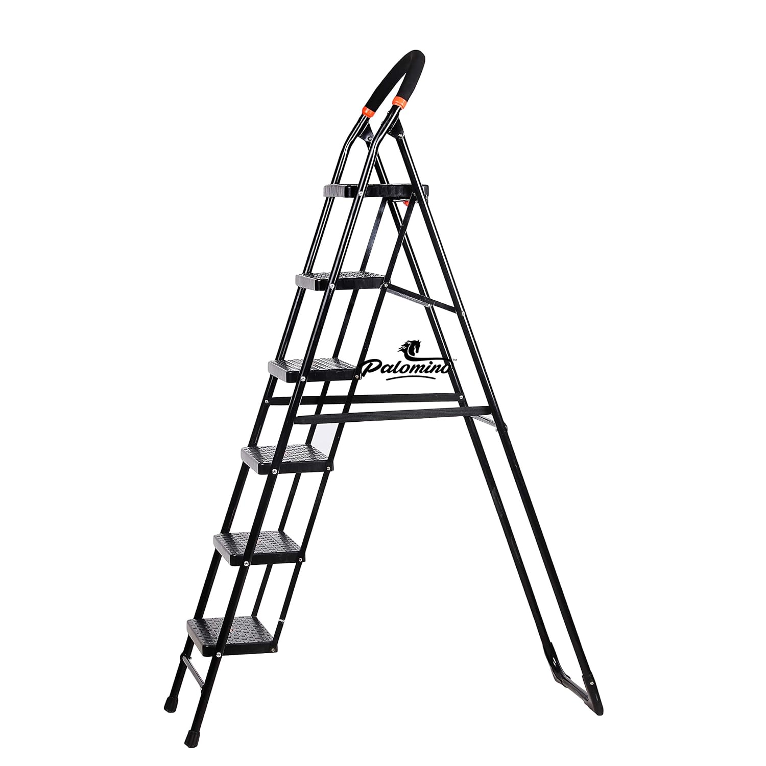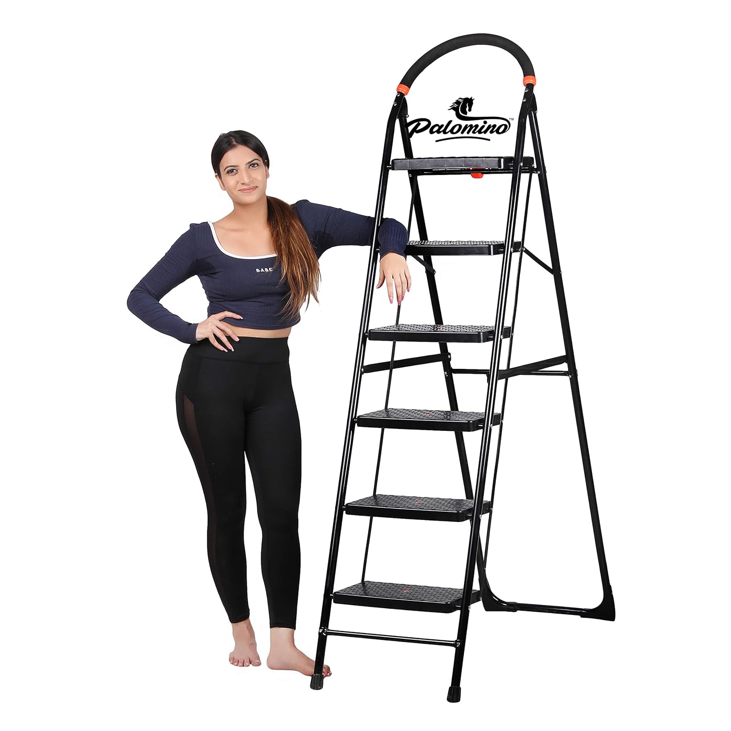 Home STEP LADDERS PALOMINO Black Heavy Duty Folding Stepladders with Wide 6 Steps Ladder Sidhi (Make in India)
