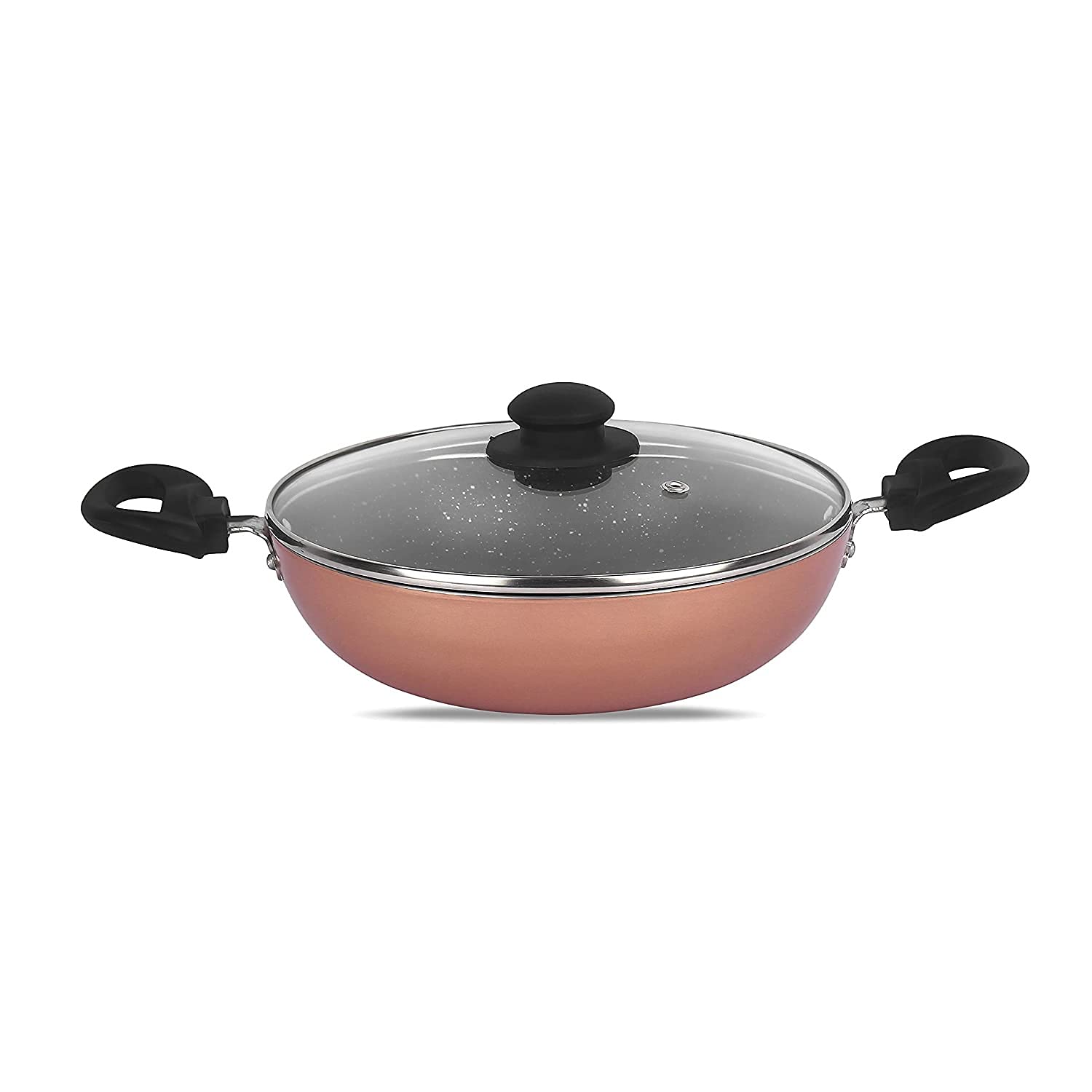 Home COOOKWARE Palomino Heavy Duty Aluminium Non-Stick Deep Kadhai 3mm Thickness Kadhai Cookware with Glass Lid (24 cm, Pack of 1, Copper Color, Non-Induction Base)