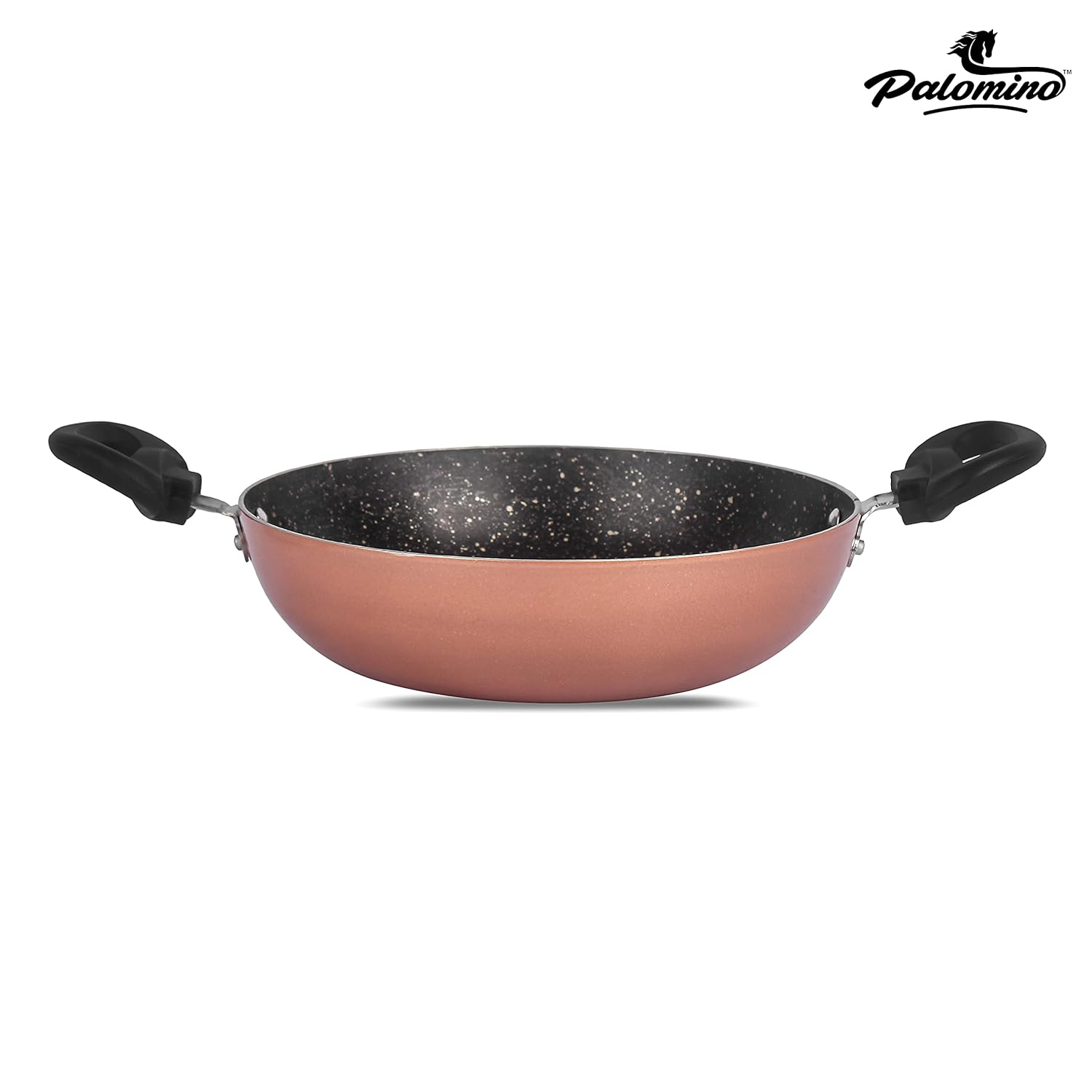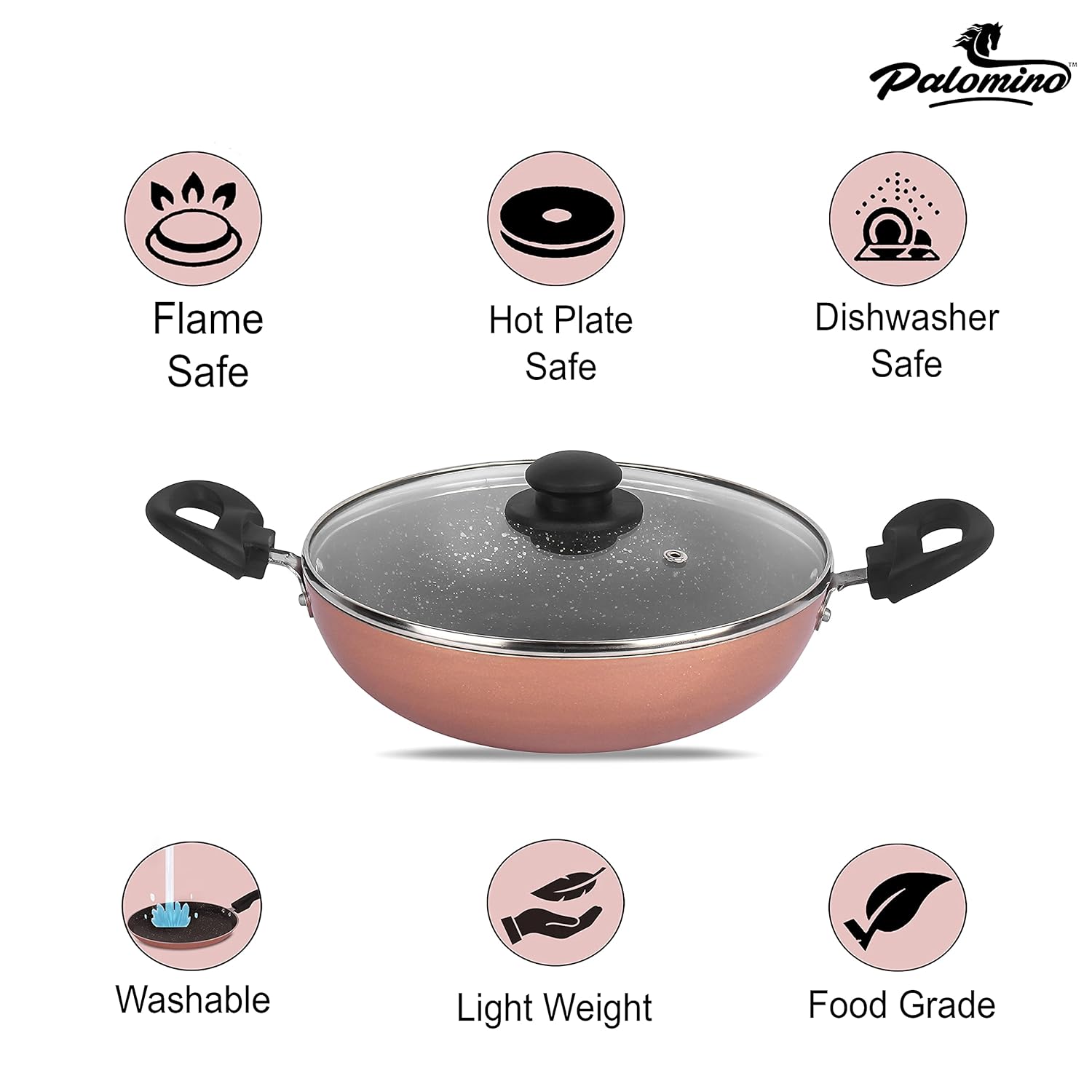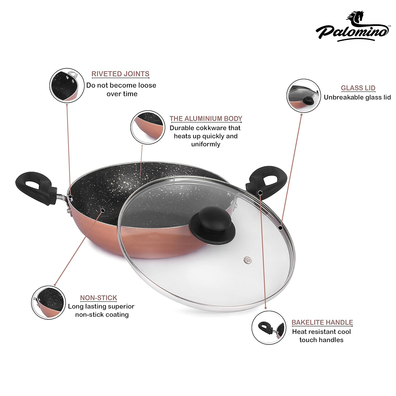 Palomino Heavy Duty Aluminium Non-Stick Deep Kadhai 3mm Thickness Kadhai Cookware with Glass Lid (24 cm, Pack of 1, Copper Color, Non-Induction Base)