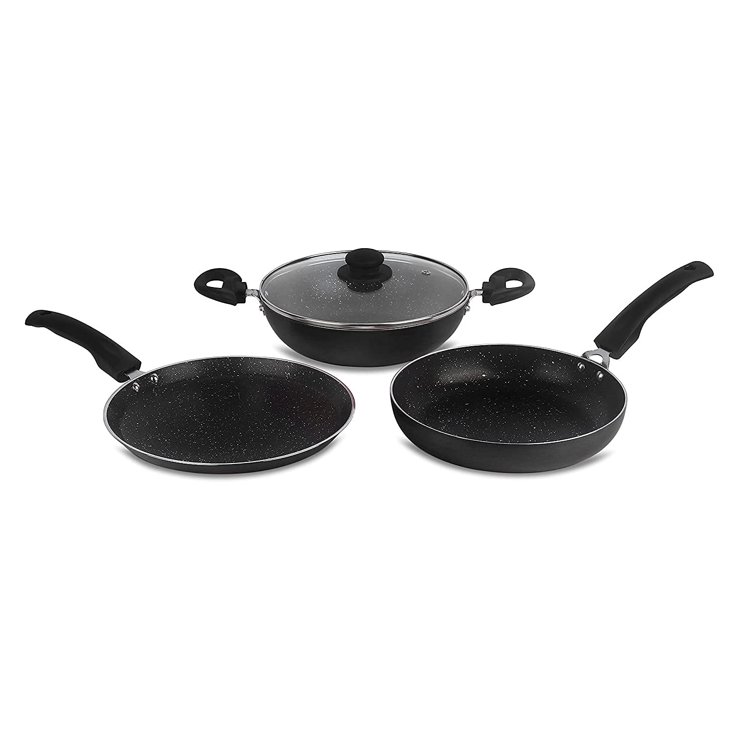 • Included Components: Fry Pan, Tawa/Griddle and Kadhai/Wok With Glass Lid; Color: Black