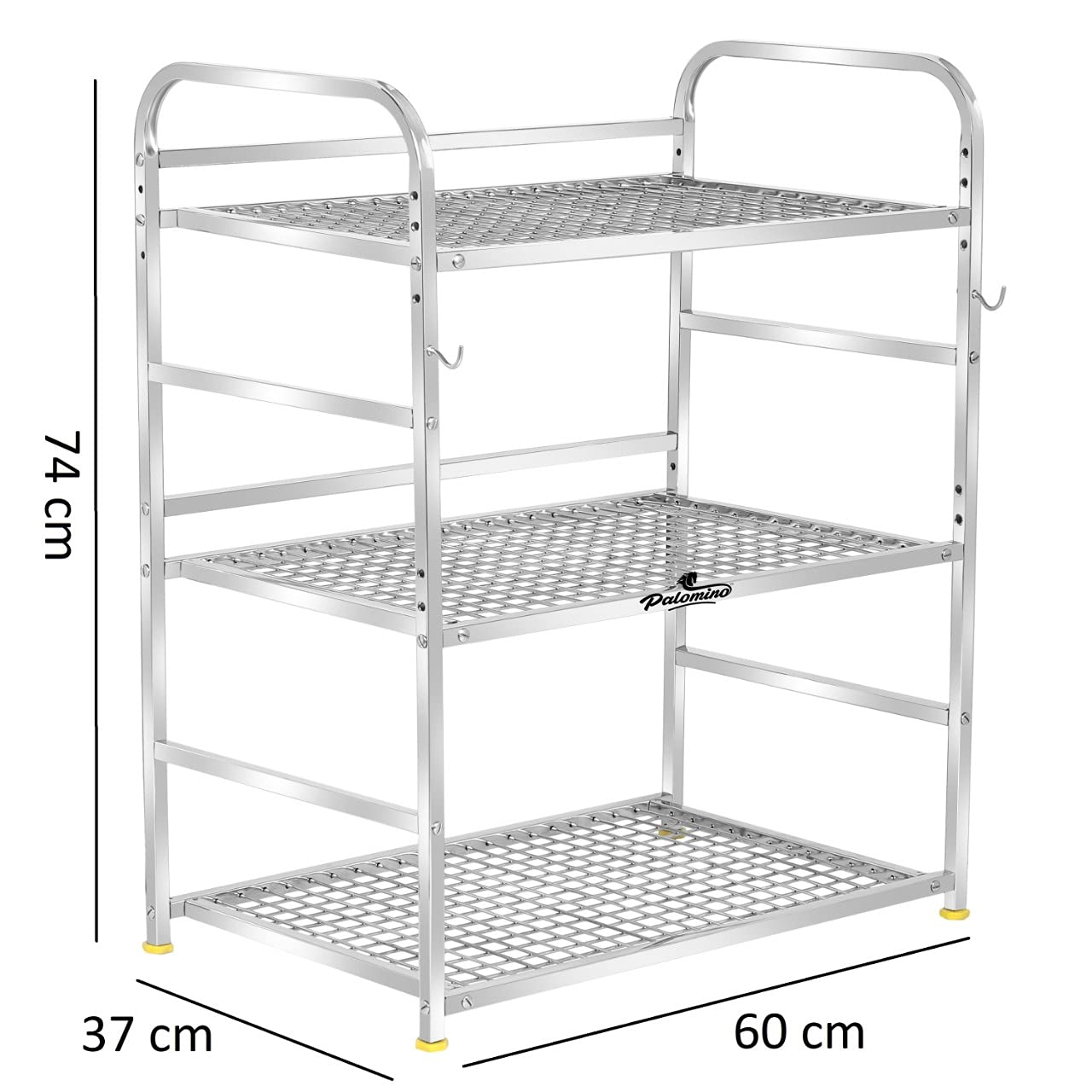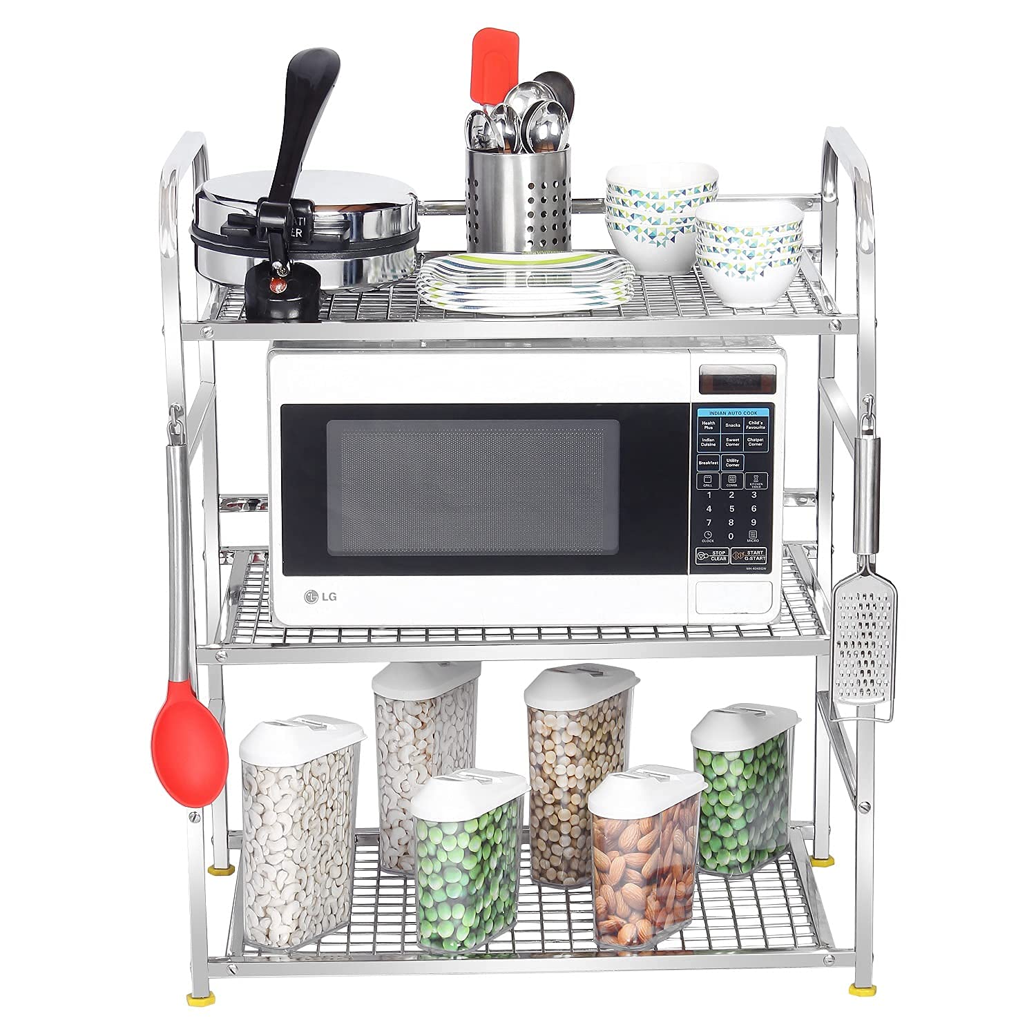 Home MICROWAVE STAND Palomino Kitchen Microwave Shelf, Stand Kitchen Counter Shelf Organizer, Spicy Shelf Rack Toaster Organizer, Microwave Oven Rack, 3 Tiers with 2 Hooks (75 x 38 x 11 cm, Stainless Steel, Tiered Shelf)