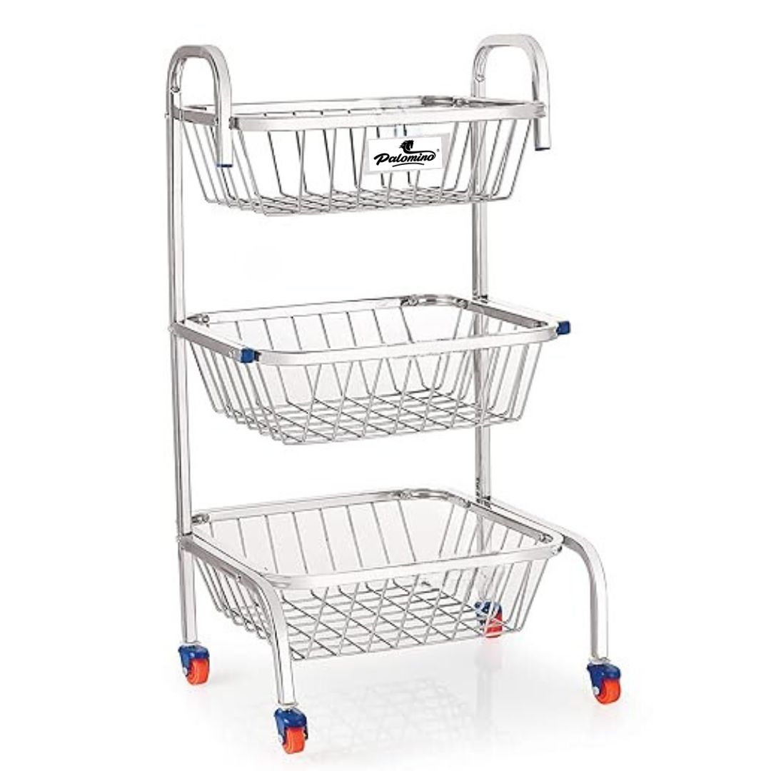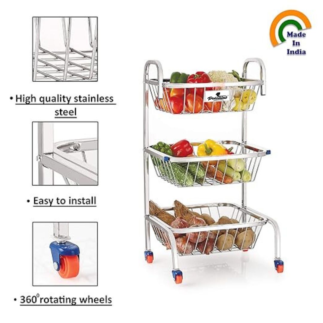 Palomino 3 Layer Stainless Steel Fruit & Vegetable Kitchen Trolley | Vegetable Basket | Fruit Basket | Vegetable Stand for Kitchen Storage | Onion Potato Rack for Kitchen (SUPERDLX-3SHELF, 3 Shelf)