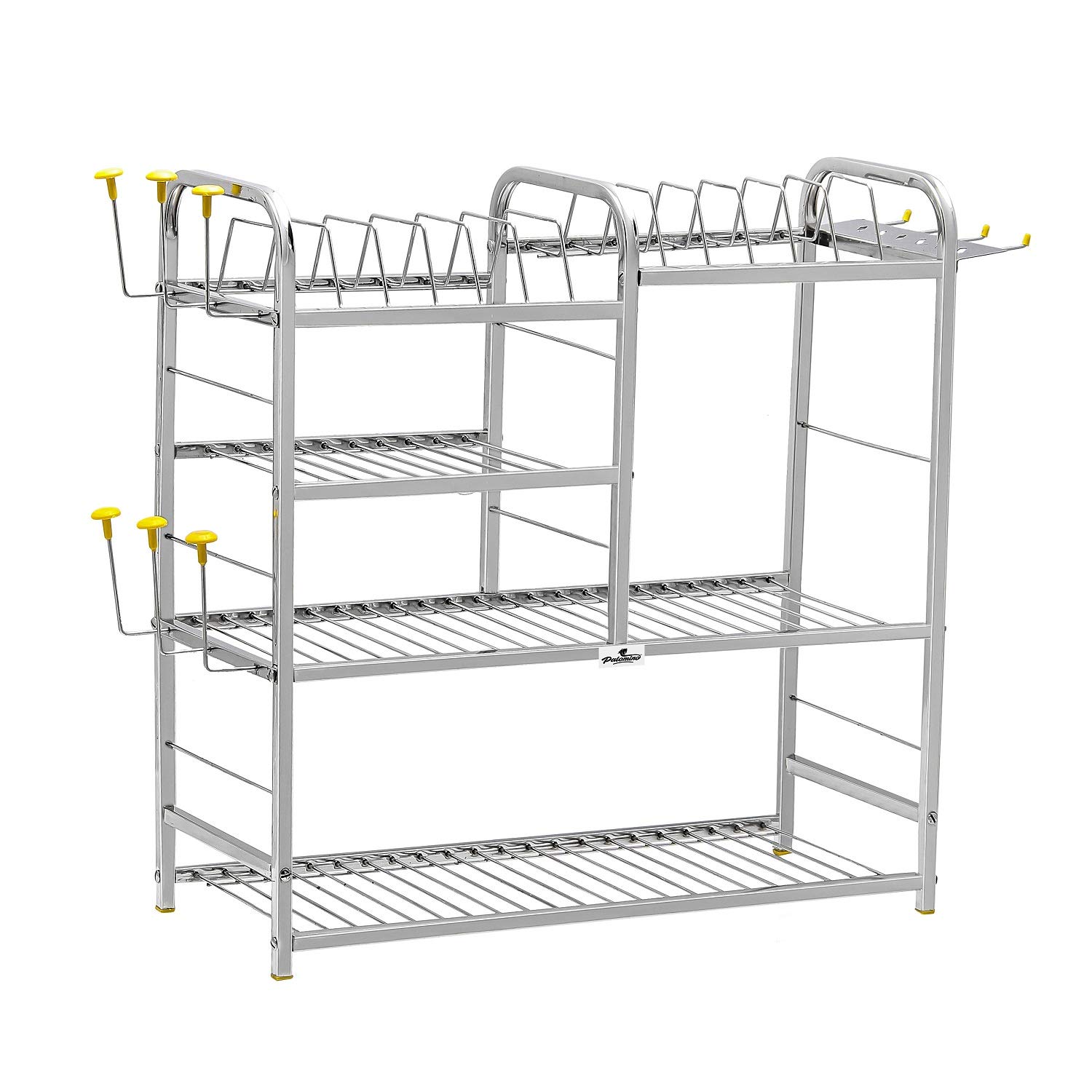 • Durable, Strong and Sturdy construction with premium seamless welding for smooth finish 100 % Non Magnetic Stainless Steel with Five layer Decorative Rust Proof Plating. Stainless Steel Kitchen Rack with ample space to neatly store your daily use crockery and cutlery