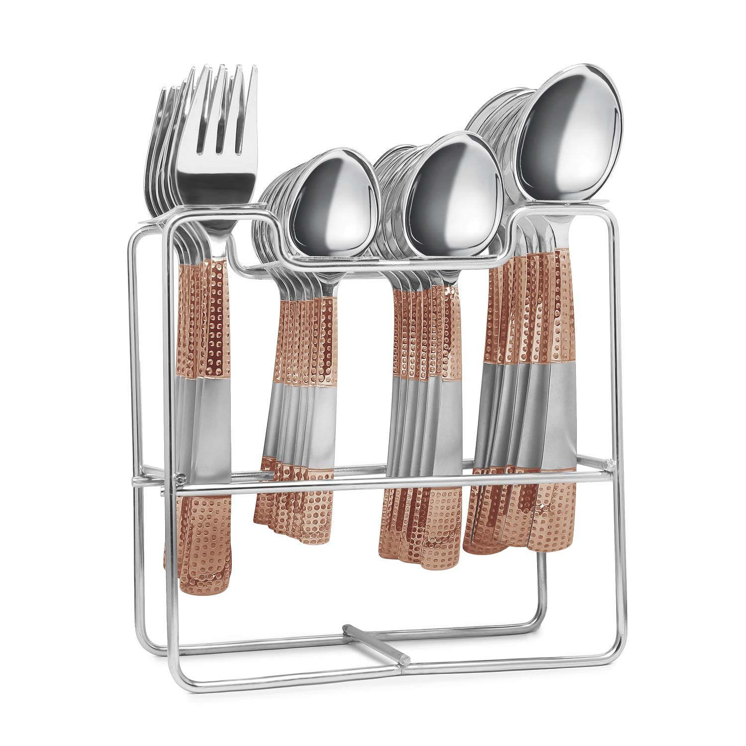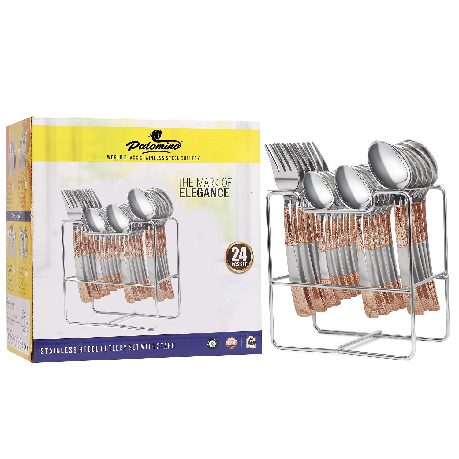 PALOMINO World Class 24 Pcs Cutlery Set with Stand [Content : 6 Pcs Dinner Spoon, 6 Pcs Dinner Fork, 6 Pcs Desert Spoon, 6 Pcs Tea Spoon and 1 Pcs Stand| Stainless Steel Cutlery Set (Pack of 25)